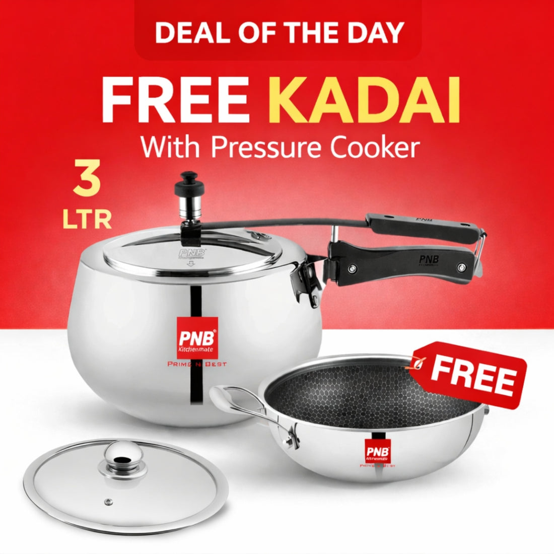 Buy Stainless Steel Triply 3 Ltr Pressure Cooker and get 22 cm Honey Comb Non Stick Kadhai FREE
