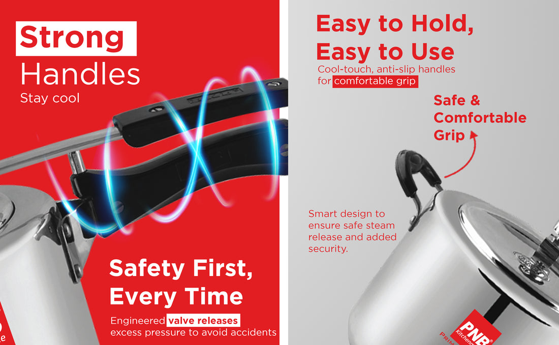 Ergonomic Handle: The pressure cookers features a professionally designed handle with heat-resistant properties and ergonomic grip, ensuring maximum safety and comfort during cooking while preventing accidental slips.