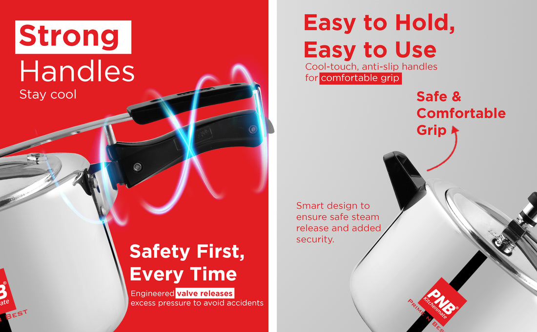 Ergonomic Handle - The pressure cookers features a professionally designed handle with heat-resistant properties and ergonomic grip, ensuring maximum safety and comfort during cooking while preventing accidental slips.