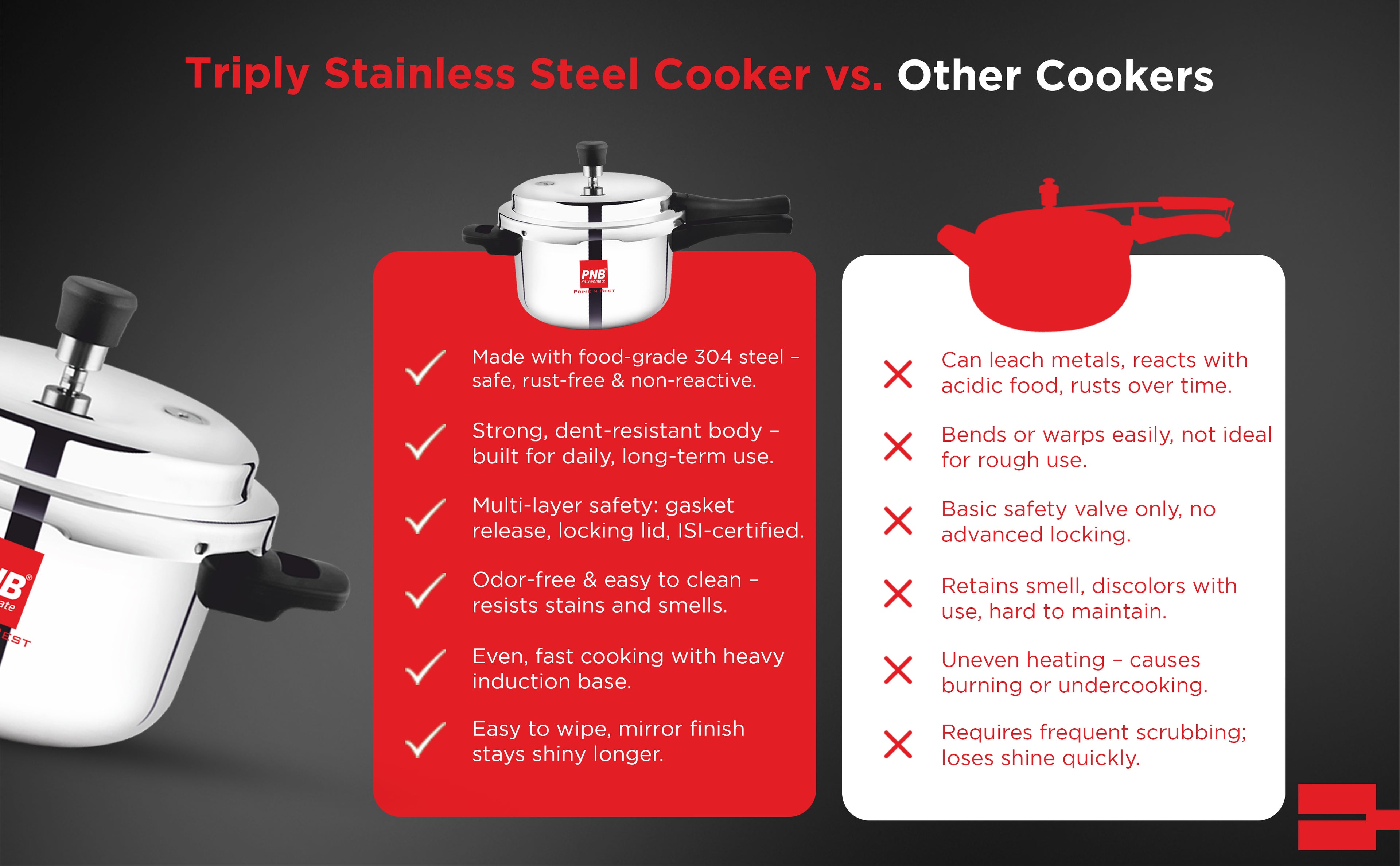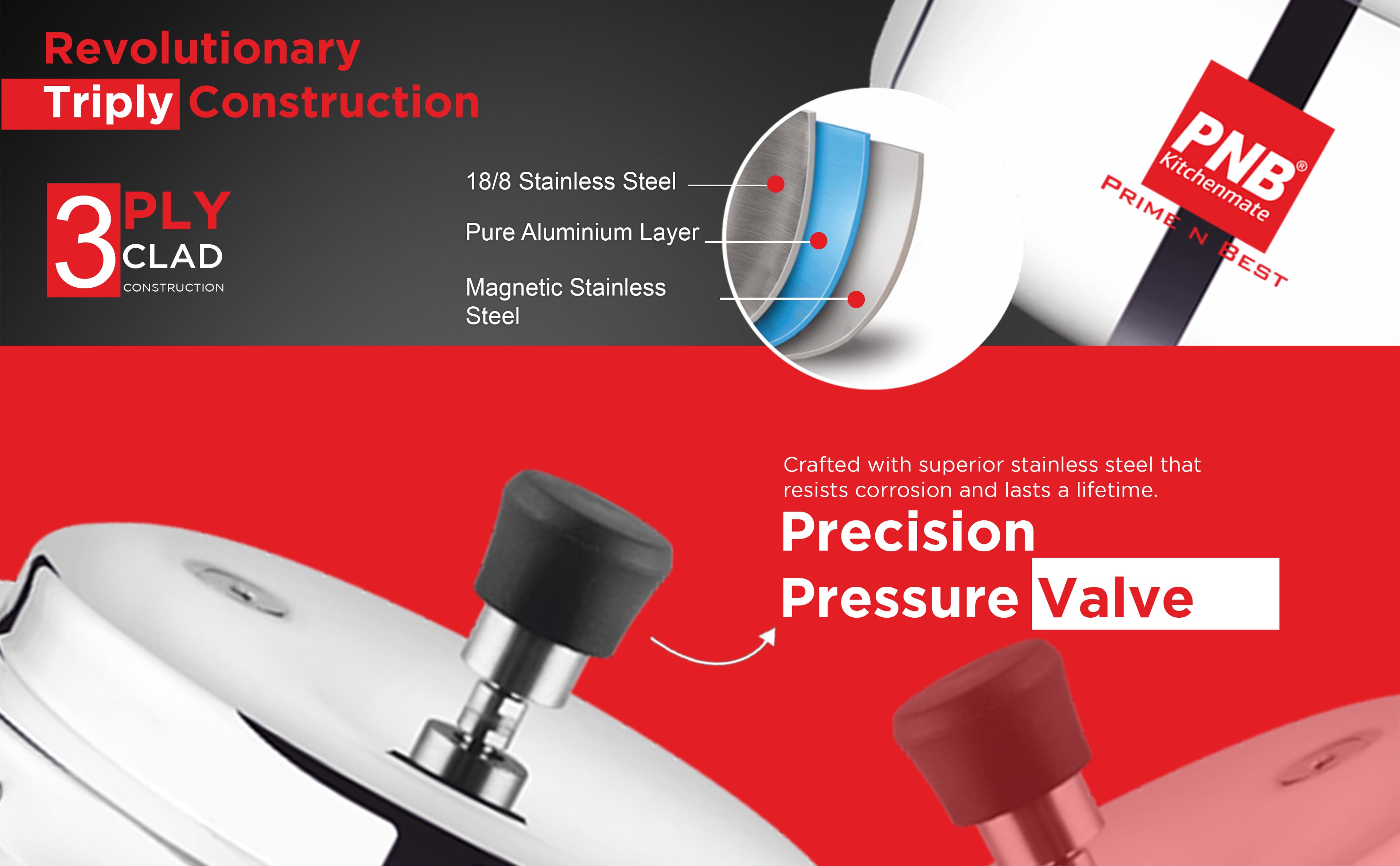 PNB Kitchenmate Triply Cooker: Outer Lid Pressure Cooker Induction and Gas Base - Induction Pressure Cooker With Inner Lid, Induction Cooker, Mirror Finish, Thickness: 2.5mm, Silver | 2.5L