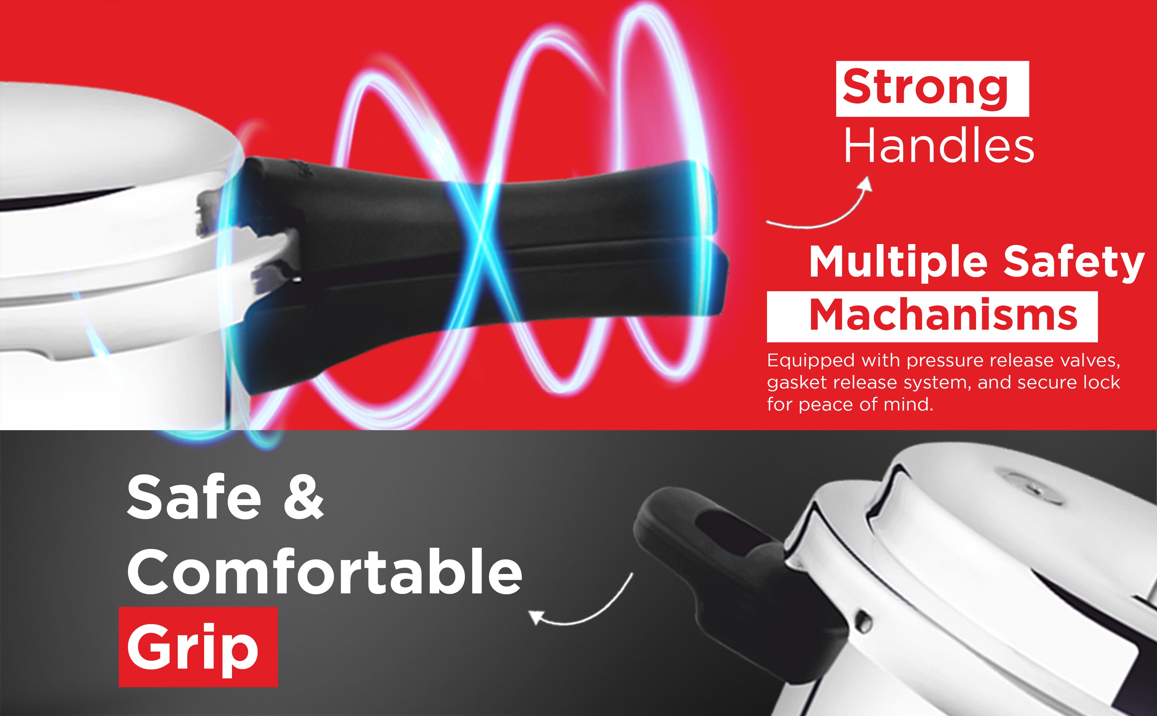 ENHANCED GRIP: This pressure cooker designed with a comfortable, ergonomic grip to ensure a secure hold, enhancing both safety and control, Feel the difference with a handle engineered for comfort and stability, giving you total control in every use.