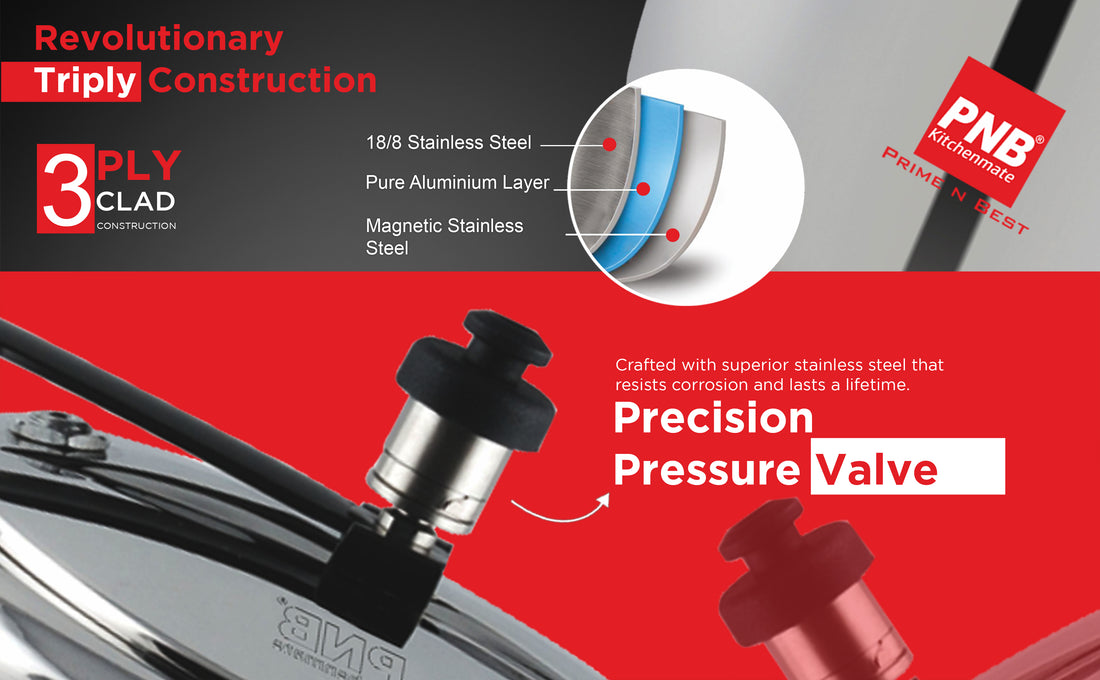 Triply Construction: Our inner lid pressure cooker features a triply construction with three layers—18/8 stainless steel, pure aluminum, and magnetic stainless steel. This design ensures even heat distribution and energy-efficient cooking.