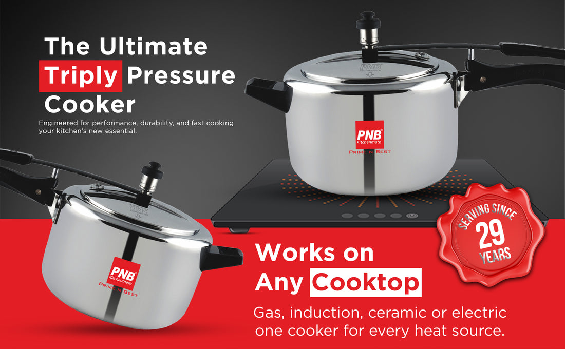 PNB Kitchenmate Triply Cooker -Triply Steel Pressure Cooker Induction and Gas Base, Induction Pressure Cooker, Mirror Finish, Thickness: 2.5mm, Silver