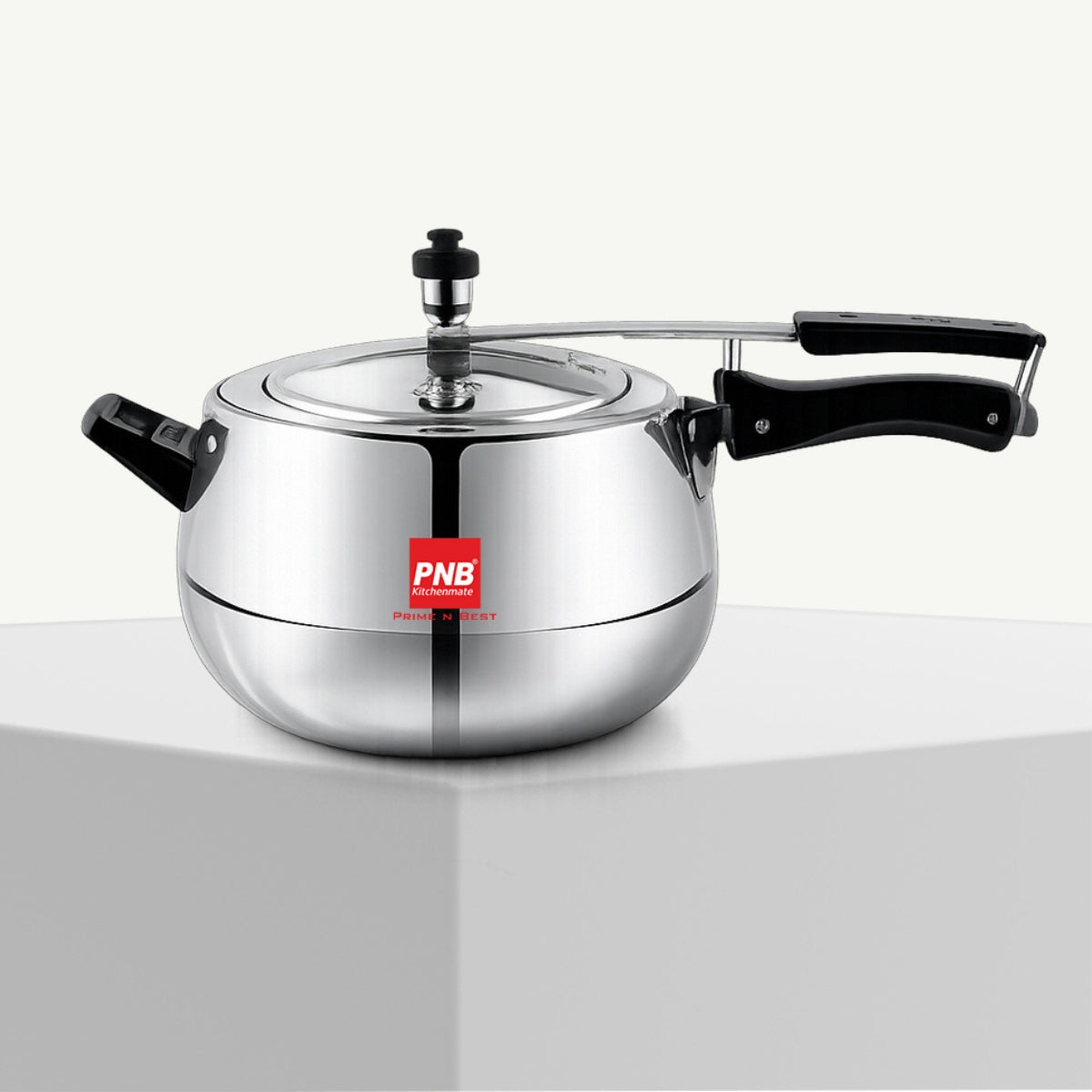 PNB Kitchenmate Euro Triply Cooker: Pressure Cooker Induction and Gas Base, Induction Pressure Cooker With Inner Lid, Induction Cooker, Mirror Finish, Thickness: 2.5mm, Silver | 2L