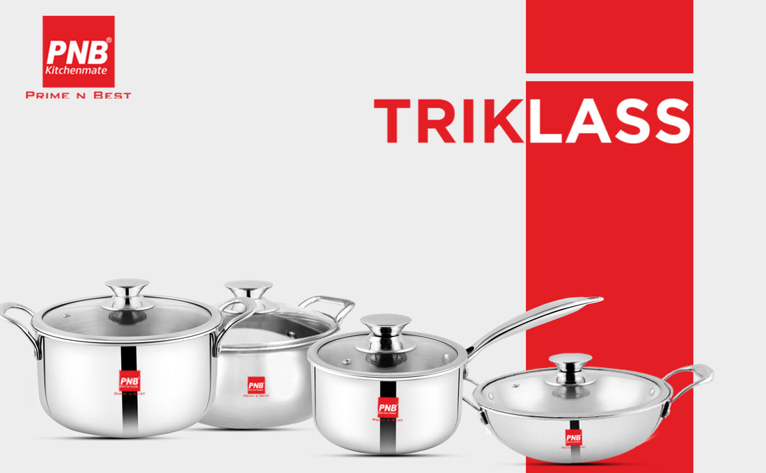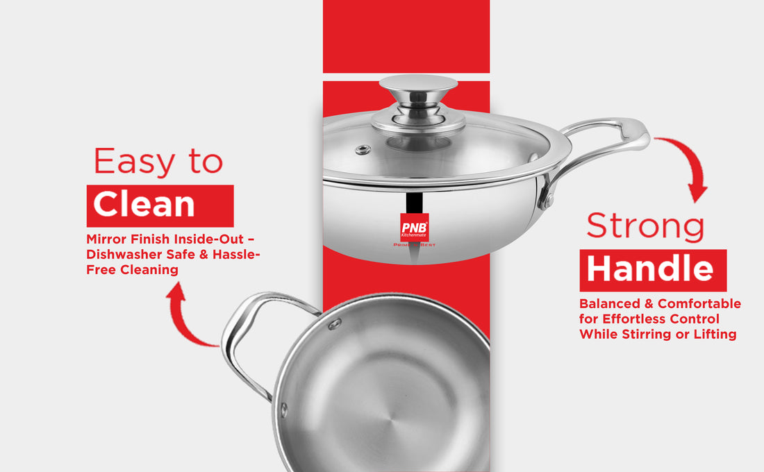 PNB Kitchenmate TriKlass Triply Karahi with Glass Lid - Gas Compatible - 3-Ply Clad Construction - Dishwasher Safe - Triply Stainless Steel Kadai for Perfect Cooking