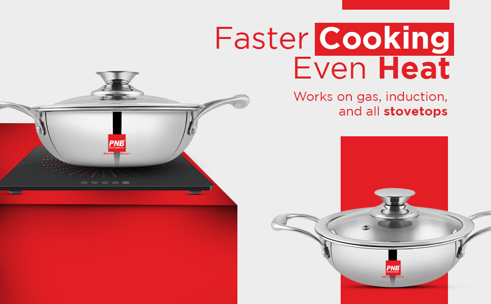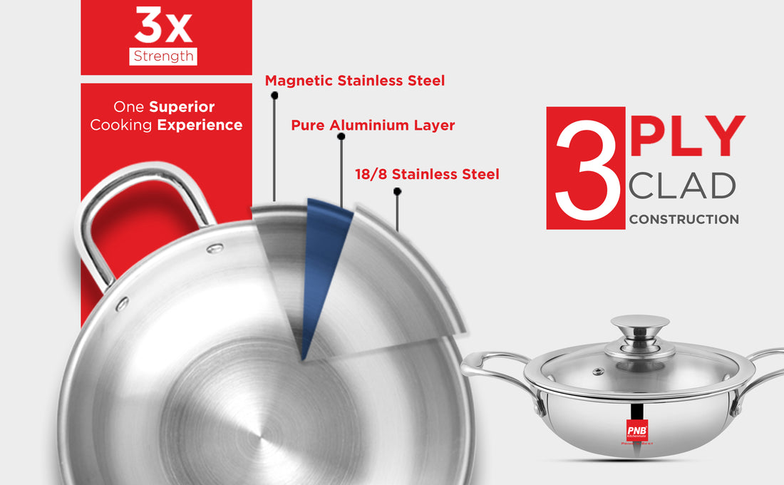 Premium 3-Ply Clad Construction: Our TriKlass Karahi features a 3-ply construction with a combination of magnetic stainless steel, pure aluminum, and 18/10 stainless steel, ensuring superior heat distribution and durability for perfect cooking results every time.