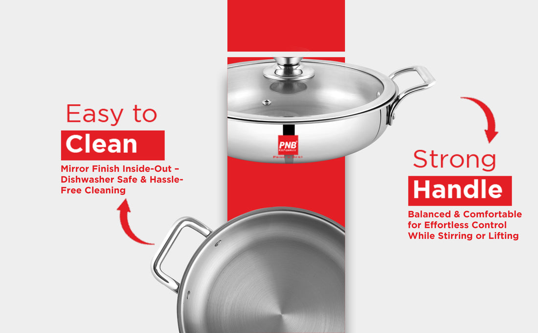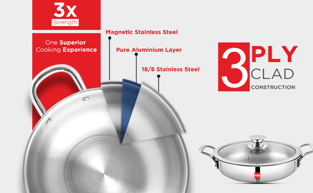 Premium 3-Ply Clad Construction: Our TriKlass Karahi features a 3-ply construction with a combination of magnetic stainless steel, pure aluminum, and 18/10 stainless steel, ensuring superior heat distribution and durability for perfect cooking results every time.