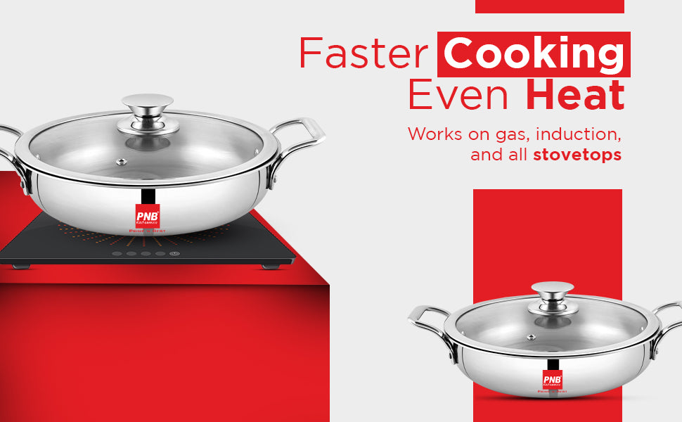 PNB Kitchenmate TriKlass Shallow Triply Karahi with Glass Lid – Gas Compatible - 3-Ply Clad Construction - Triply Stainless Steel Kadai - Lifetime Warranty